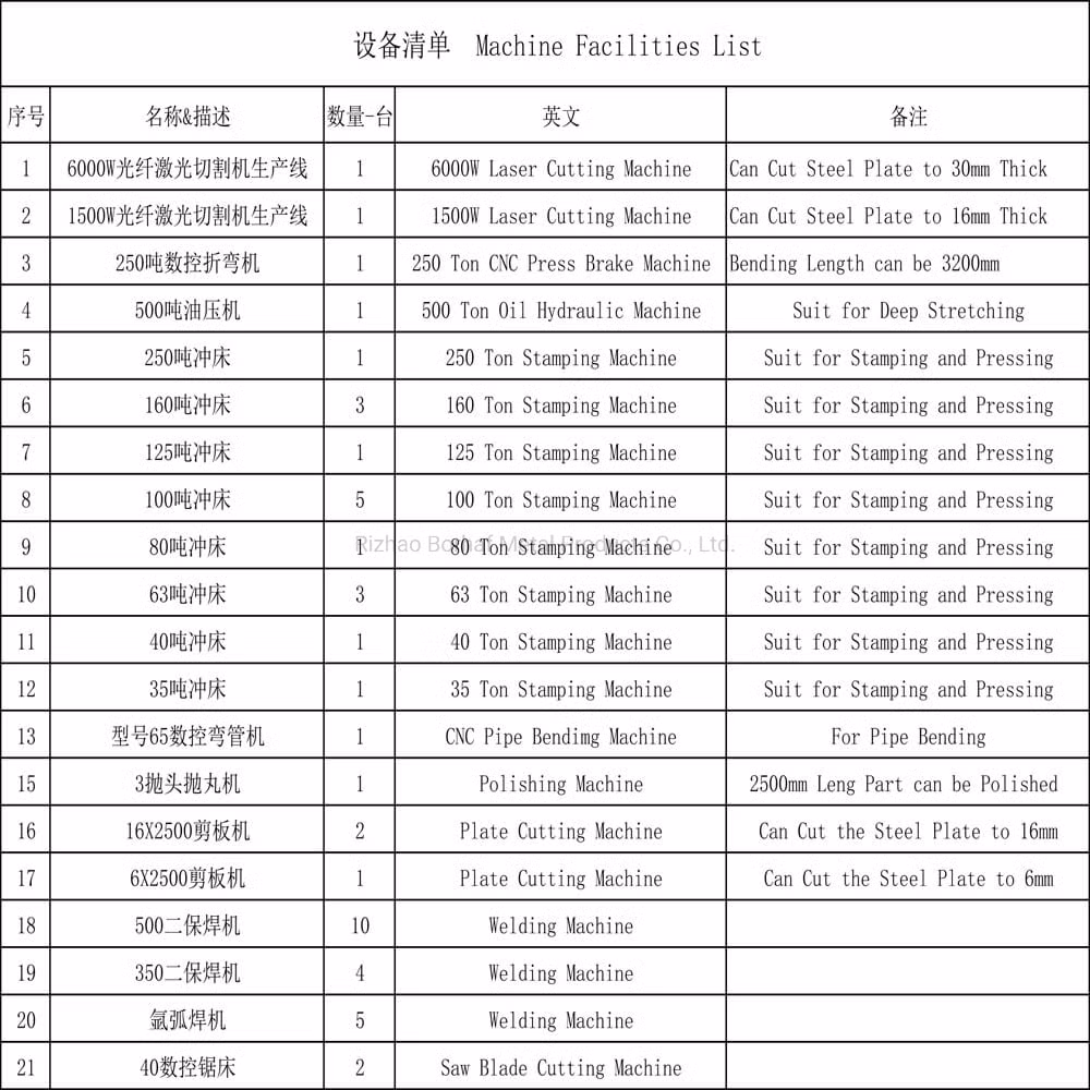 Siamo uno stabilimento leader in Cina con un team di 65 professionisti dedicati, specializzati in una gamma di servizi di alta qualità su misura per la lavorazione dei metalli, come la fabbricazione, punzonatura, saldatura, taglio, piegatura, Sagomatura, progettazione, CNC, lucidatura e finitura. Siamo rinomati per la nostra qualità e precisione in vari settori, tra cui attrezzature logistiche, automotive, orticoltura, lavorazione legna da ardere, attrezzature agricole, costruzione di terreno, costruzione di legno e industria di hardware di sicurezza di traffico.